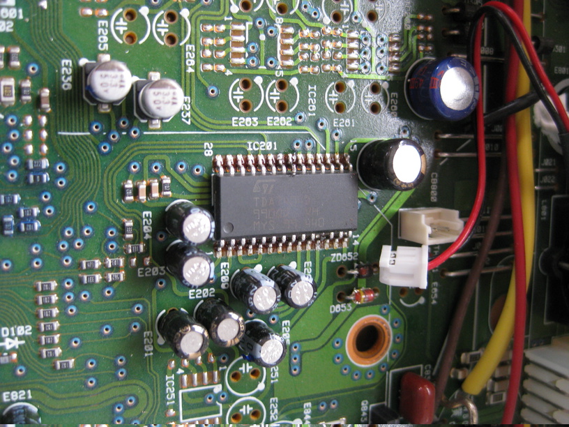Opening it up was rather uneventful. I hooked up an iPod to the auxiliary input and traced the audio as far as IC201, a TDA7404D made by ST Microelectronics. This IC switches between the various input sources and also applies volume and tone settings. The datasheet is available here.