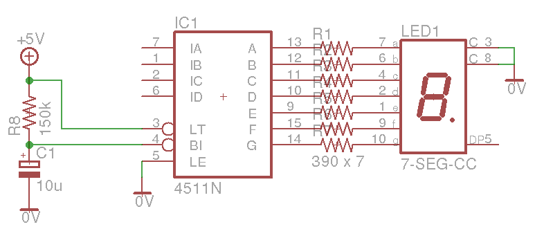 Note that C1 and R8 are optional; these cause the 4511 to blank the display for a second or two at switch on. This is to prevent the display producing garbage while the Arduino loads its bootloader. If you omit them, connect pin 4 to 5v.