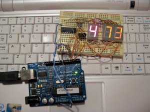 Here’s an example on multiplexing three seven-segment LED displays from an Arduino using a single 4511 IC and a handful of transistors. This builds on my last post about interfacing to a single display