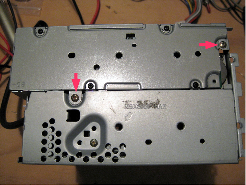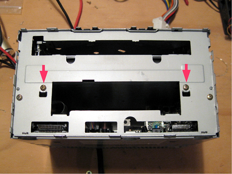 To open the unit up, unclip the front panel first. Remove the screws as marked in the photos below and lift the CD changer mechanism off. Be careful not to damage the ribbon cable; this can be properly disconnected by carefully pulling it out of either connector.